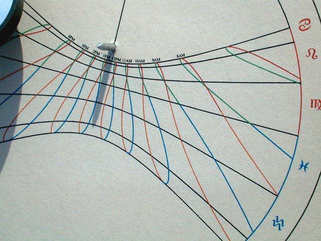 The black curves (hyperbolas) represent the months of the Zodiac. The lowermost curve in the first image represents the locus of the gnomon's shadow for 22 December. The hyperbola for 21 March or 23 September is a straight line (forth from either end). The uppermost hyperbola is for 21 June. (Note that the five inner curves each represent two months in opposite seasons.)